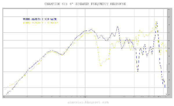 Il mio principale riferimento per le modifiche sul Champion 600, akavalve, ha fatto una piccola analisi in questa direzione, testando tre diversi coni a confronto con quello stock (http://akavalve.blogspot.it/2009/10/cahmpion-600-speaker-upgrade-comparison.html). Oltre a confrontarne le differenze al suo orecchio, ha voluto valutarne la risposta in frequenza (analisi che poi ha giustificato alcune delle impressioni che si era fatto). Ovviamente, le tabelle sotto riportate sono opera sua.