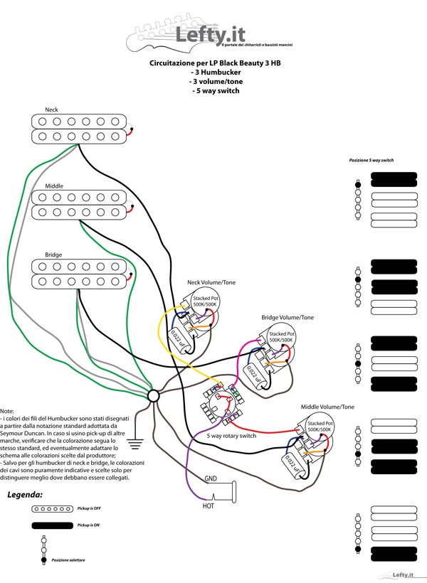 In questo diagramma ho scelto le 3 configurazioni tipiche della Les Paul (neck, bridge, neck+bridge) a cui aggiungere quelle tipiche della Strato (neck+middle, middle+bridge). Dovendo fare una scelta, ho rinunciato alla configurazione con il solo pick-up middle attivato.